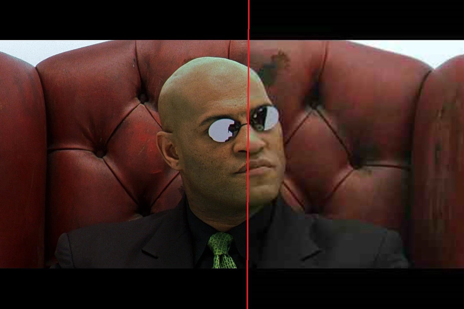 Comparativa con la nitidez puesta al máximo (izquierda) y en el valor correcto (derecha). Se parecian cambios en el color y nubes de píxeles en textos y personajes. Imagen: Teledeporte