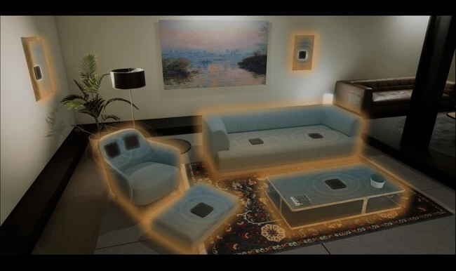 El conjunto del transductor puede ocultarse bajo el suelo, en el interior de las paredes, bajo las mesas de centro o bajo los sofás, convirtiendo así casi cualquier superficie sólida de la sala en un altavoz con vibración en sí mismo que convendrá complementar con un subwoofer tradicional para poder ampliar el rango de audio total hasta las bajas frecuencias.