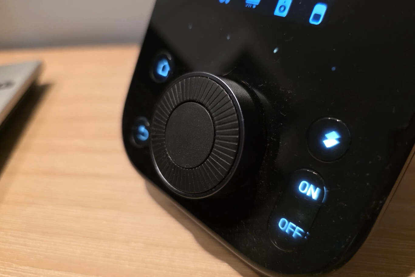 Además, incluye un dial multifunción con controles en cuatro direcciones, rueda y botón central. A la derecha se sitúan los botones de Home y Atrás, mientras que en el lado opuesto encontramos los de Opciones, On y Off. La función de estos controles cambia según el dispositivo gestionado, adaptándose de forma dinámica.