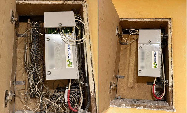 En la imagen que acompaña el artículo se aprecia claramente la diferencia entre la instalación original, con toda la maraña de cables de cobre, y el nuevo estado, mucho más limpio y despejado, lo que facilita las futuras acometidas de fibra.