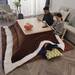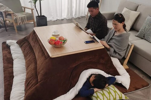El kotatsu está preparado para que bajo dicho tablero se coloque una manta grande y gruesa, una colcha o edredón que cubre toda la superficie y permite a los usuarios sentarse a la mesa tapándose con dicha tela. ¿El resultado? Pues que tenemos las piernas y parte baja del cuerpo bajo esta especie de tienda de campaña calefactada, calentando la sangre poco a poco y manteniendo la mitad superior del cuerpo fresca.