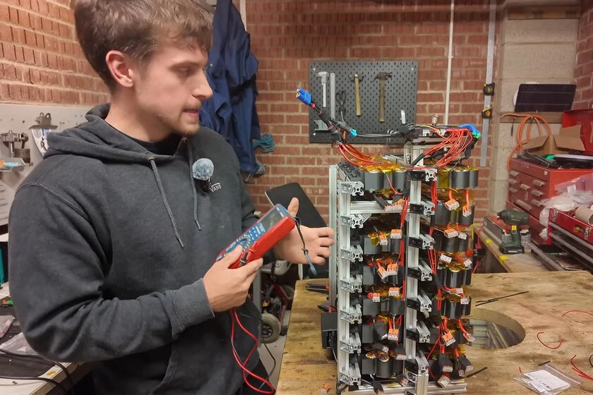 ¿El resultado? Pues una batería gigante de casi 40 kilos de peso con una capacidad total de 2,52 kWh que asegura fue capaz de suministrar energía a su taller perfectamente. En el futuro espera además instalar paneles solares en el tejado para recargar las baterías.