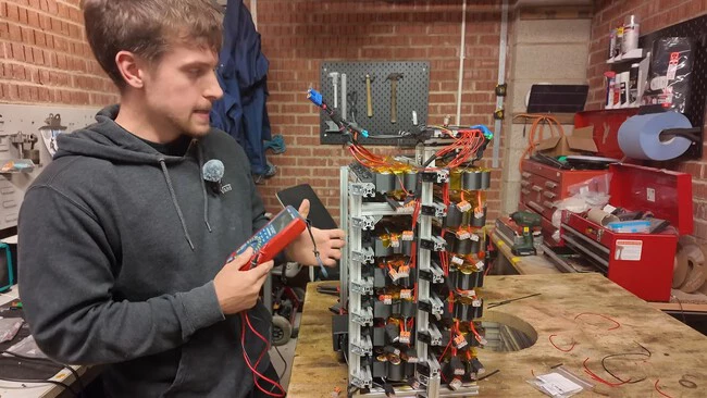 Las baterías que estaban bien fueron etiquetadas, recargadas y organizadas en módulos de nueve unidades sujetos con soportes especiales impresos en 3D, tratando de imitar la estructura de las baterías de los coches eléctricos. Así pudo juntar 56 de estos módulos para crear un conjunto capaz de suministrar 50 voltios de corriente continua.