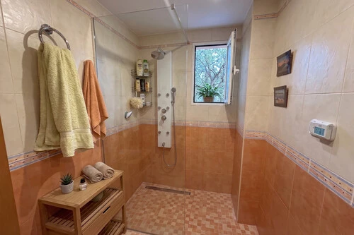 Una opción más decorativa son los paneles con perfiles de color, como por ejemplo en negro mate, que enmarcan el cristal y dan más protagonismo a la ducha dentro del baño.