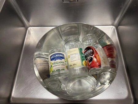 Ahora, al sacar los botes del agua, puedes retirar las etiquetas con facilidad. Verás que algunas se despegan sin esfuerzo y dejan el cristal limpio y sin rastro, aunque otras pueden resistirse un poco más.