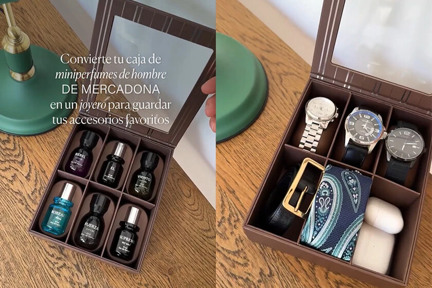 El truco está en su interior: las fragancias vienen sujetas en una base de plástico y como cuentan en @vibeofbeauty_, al darle la vuelta, se convierte en un soporte ideal para relojes. Si prefieres retirarla por completo, el hueco resultante puede usarse para guardar cinturones, corbatas, gafas, pulseras o incluso los AirPods.