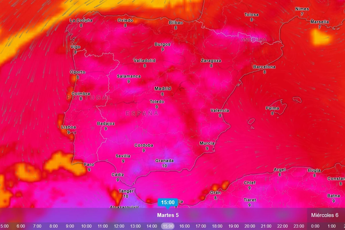 Otra opción para conocer esta predicción de forma un poco más visual (sin dar cifras concretas) es acceder a la página web de Meteored Tiempo.com, donde se muestra un mapa mundial que podemos centrar en España para observar los diferentes valores ilustrados mediante código de colores.
