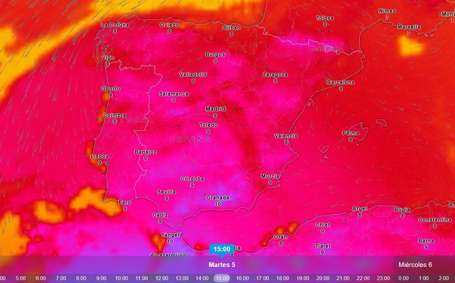 Otra opción para conocer esta predicción de forma un poco más visual (sin dar cifras concretas) es acceder a la página web de Meteored Tiempo.com, donde se muestra un mapa mundial que podemos centrar en España para observar los diferentes valores ilustrados mediante código de colores.