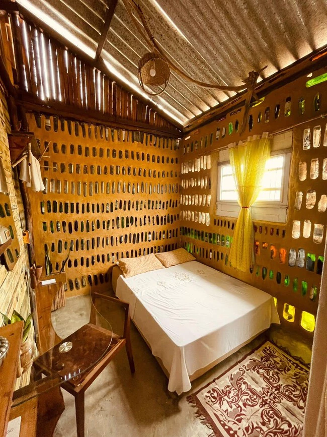Además de la gran cantidad de vidrio utilizado, incorporaron otros elementos reutilizados como madera recuperada, palés y tubos de pasta de dientes transformados en tejas. La iniciativa surgió como respuesta al problema de los residuos acumulados en una zona costera protegida afectada por el turismo.