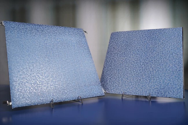 El objetivo es lograr un diseño uniforme en elementos metálicos de fachada y módulos fotovoltaicos mediante la aplicación de las películas decorativas. Y parece que lo han conseguido, ya que como vemos en las imágenes, en los primeros resultados mostrados los paneles solares resultan indistinguibles de los elementos de fachada convencionales.