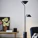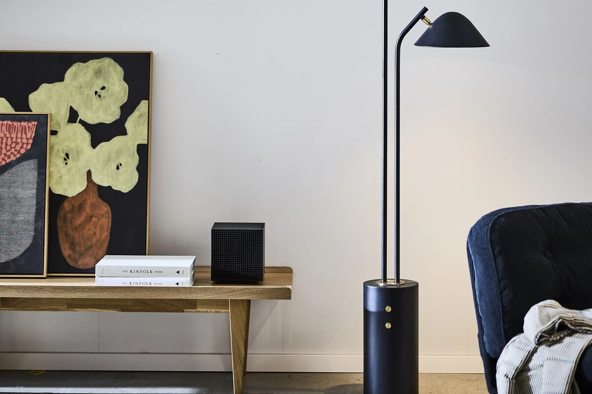 TRÅDNATE ofrece una forma más alta y arquitectónica, diseñada en torno a dos soportes estructurales paralelos, cada uno con una sombra opaca. Un foco está fijado hacia arriba para iluminar la habitación en general, mientras que el otro está dispuesto en un brazo giratorio para iluminar tareas concretas. La lámpara está anclada por una base pesada y terminada con detalles de latón.