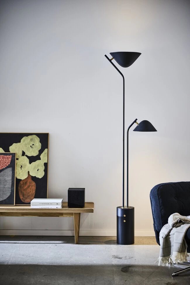 TRÅDNATE ofrece una forma más alta y arquitectónica, diseñada en torno a dos soportes estructurales paralelos, cada uno con una sombra opaca. Un foco está fijado hacia arriba para iluminar la habitación en general, mientras que el otro está dispuesto en un brazo giratorio para iluminar tareas concretas. La lámpara está anclada por una base pesada y terminada con detalles de latón.