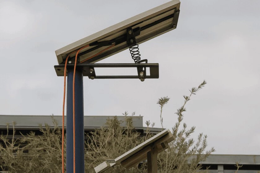 El mismo equipo creó otra solución aún más sencilla: un sistema de limpieza pasiva que usa únicamente el viento. No lleva motores ni electrónica; el panel se monta sobre un soporte flexible que le permite vibrar con las ráfagas y un pequeño resorte lo devuelve a su posición.