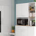 Si hay algo que se puede destacar de este mueble auxiliar de cocina es su gran capacidad. Cuenta con espacio para el microondas, cinco puertas con estantes interiores, un cajón y un espacio adicional en la parte superior derecha.