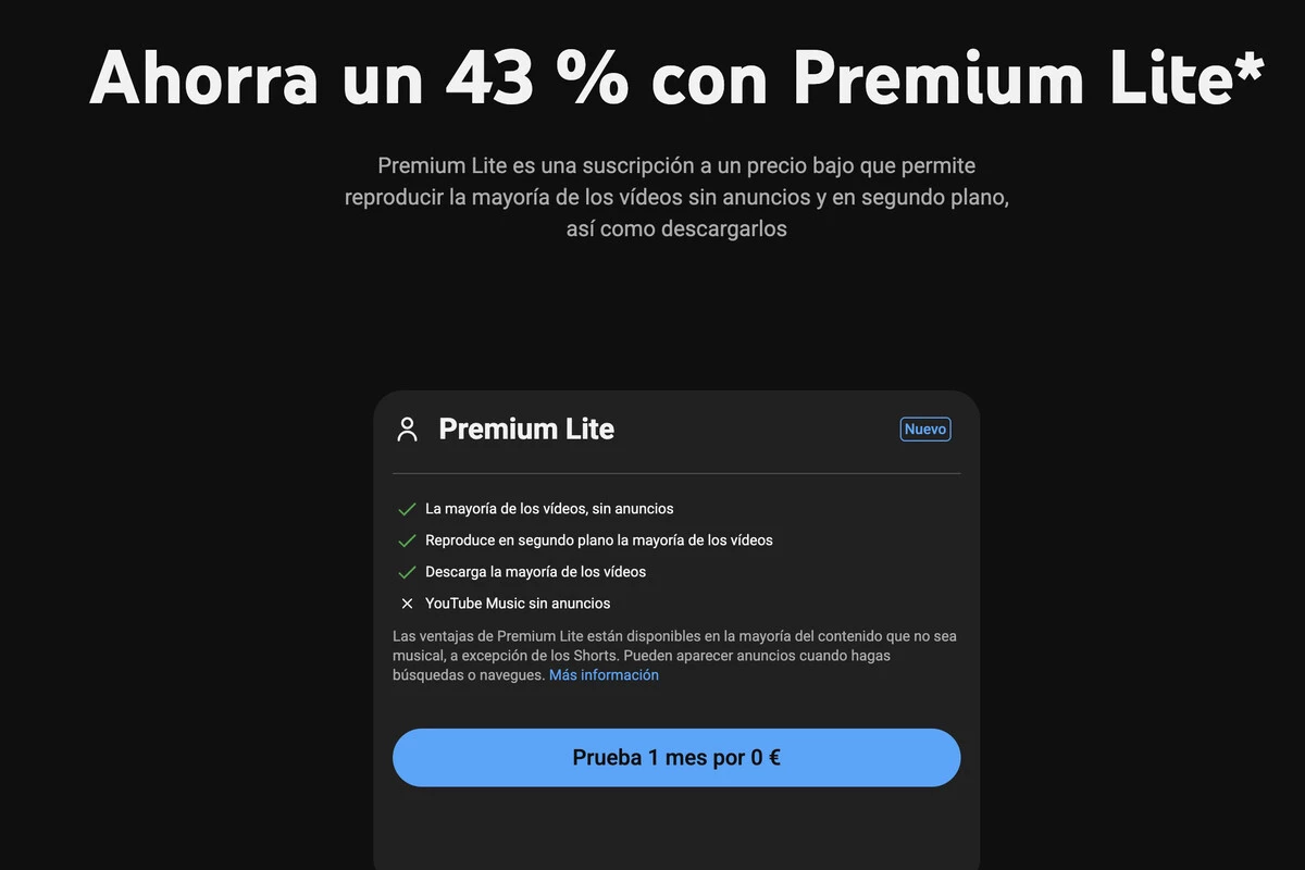 YouTube Premium Lite es más económico que la versión normal. Cuesta 7,99 euros al mes y el primer mes es gratuito, así que puedes probarlo sin pagar un euro.