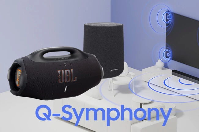 Hasta ahora, la tecnología Q-Symphony sólo se podía encontrar en barras de sonido y televisores Samsung. Con ella se consigue un emparejamiento perfecto entre ambos tipos de dispositivos; sin lags de ningún tipo y aprovechando la totalidad de los altavoces que suman tele y equipo de sonido, todo con una sincronización perfecta bajo el control de un único mando. Este año parece que dejará de encontrarse exclusivamente bajo la marca "Samsung".
