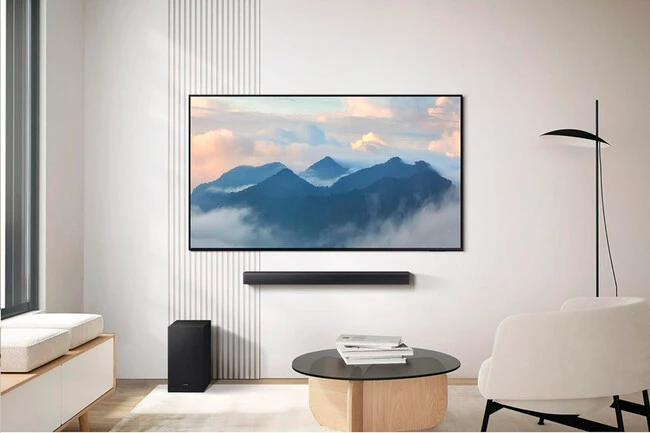 La Samsung HW-B66CF es una barra de sonido de la gama de entrada de la marca de 2025. Tiene un diseño muy similar al de la todopoderosa HW-Q990F, con un ancho de 86 cm. Viene acabada en negro y acompañada de un subwoofer inalámbrico con el que notaremos la potencia de los bajos de nuestros contenidos favoritos. Además, se puede colocar tanto sobre mueble como colgada de la pared.